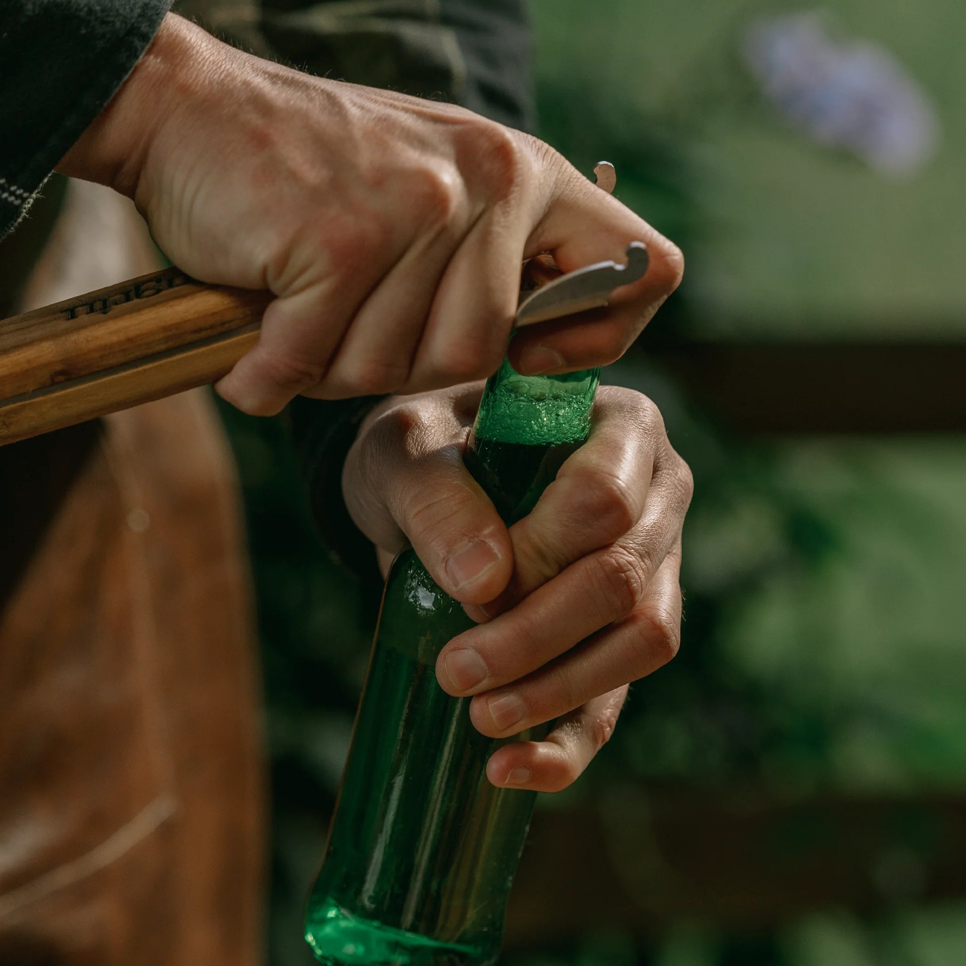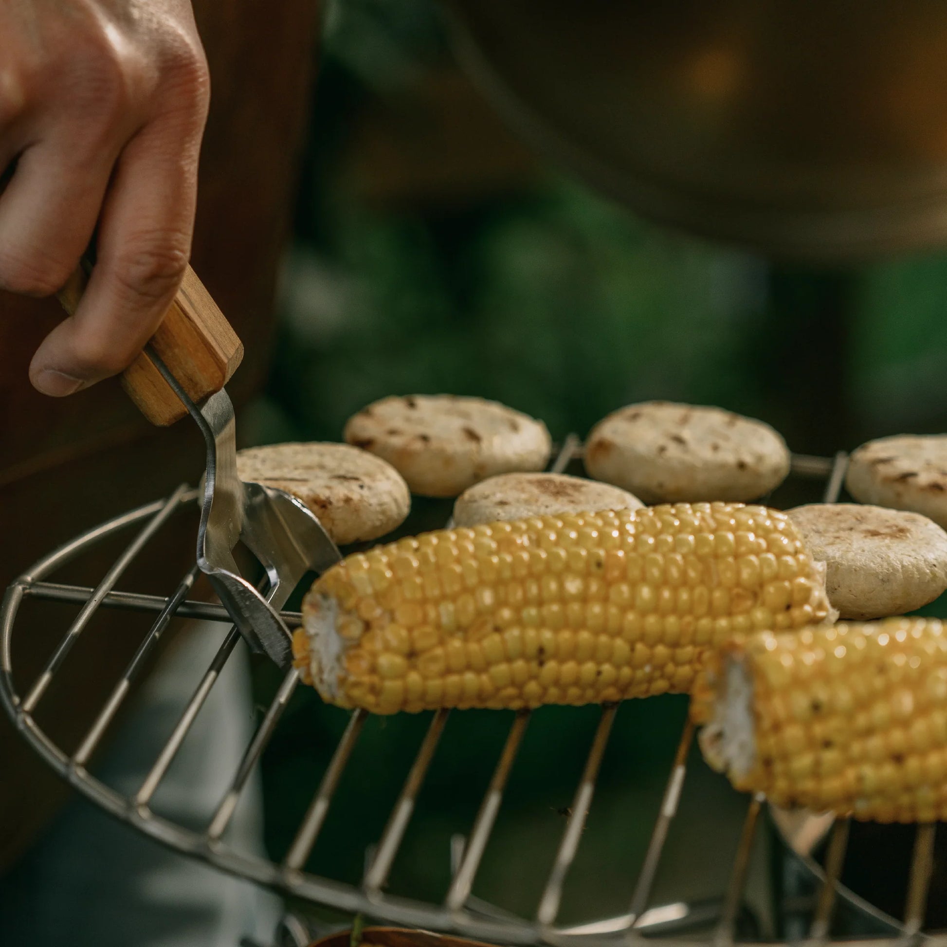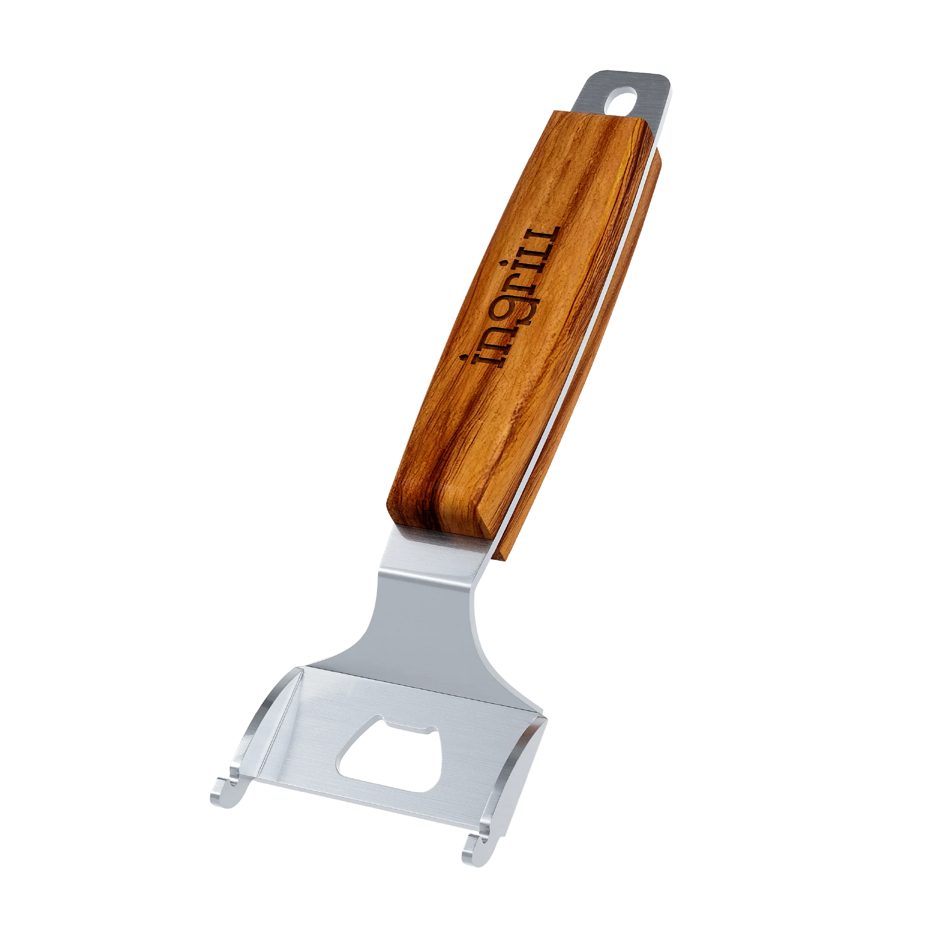 Utensilio de acero inoxidable con manija en madera de roble o teca, diseñado para manipular la parrilla. También funciona como destapador de botellas.