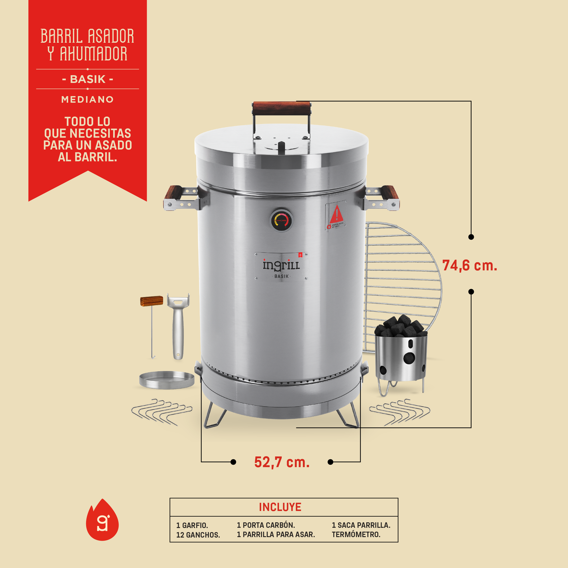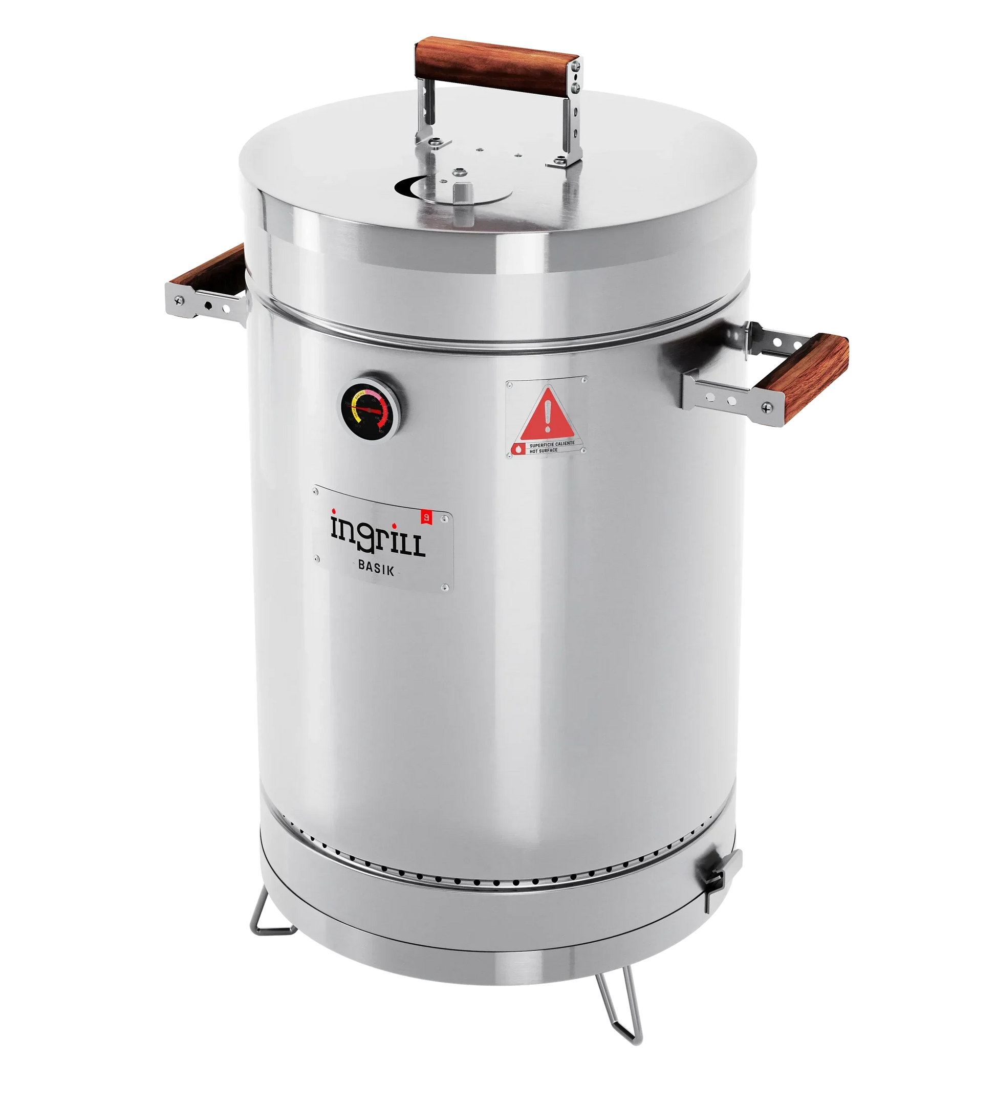 LOS BARRILES ASADORES AHUMADORES INGRILL ESTÁN DISEÑADOS Y FABRICADOS CON ACERO INOXIDABLE Y MADERAS CULTIVADAS, TORNILLERÍA DE ACERO INOXIDABLE, TERMÓMETRO, ESCLUSA DE PASO DE AIRE EN LA TAPA Y SISTEMA EXCLUSIVO DE ANCLAJE DE LA BASE AL CILINDRO.