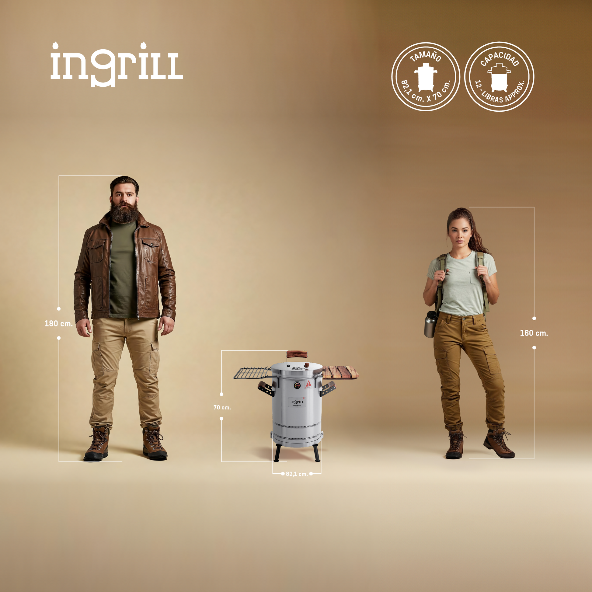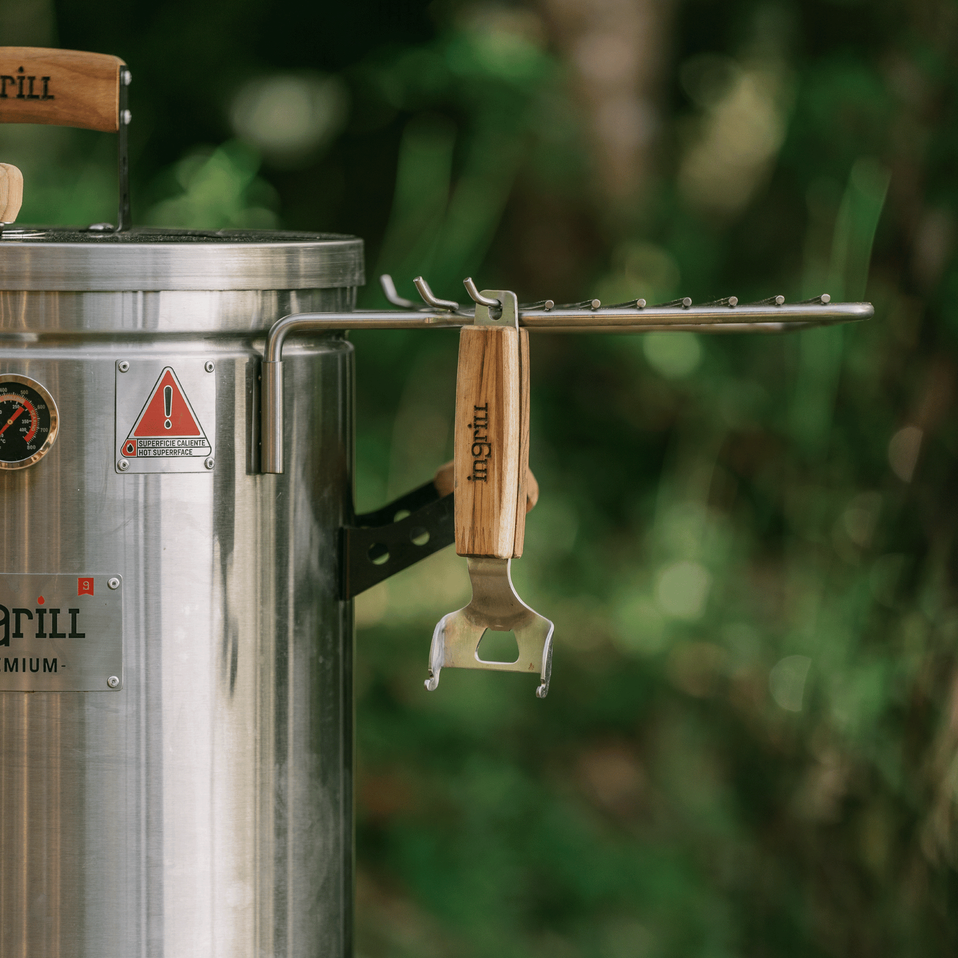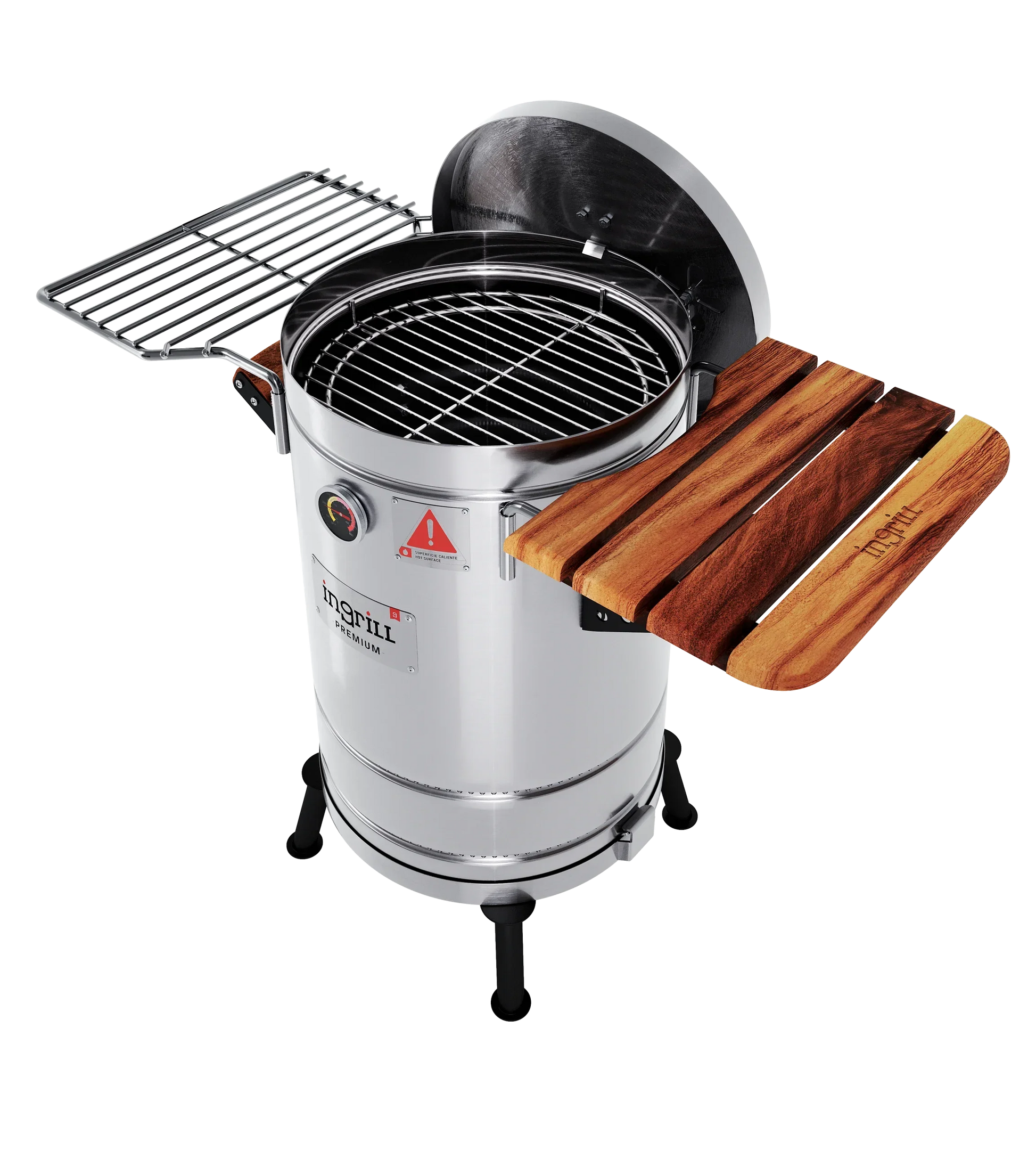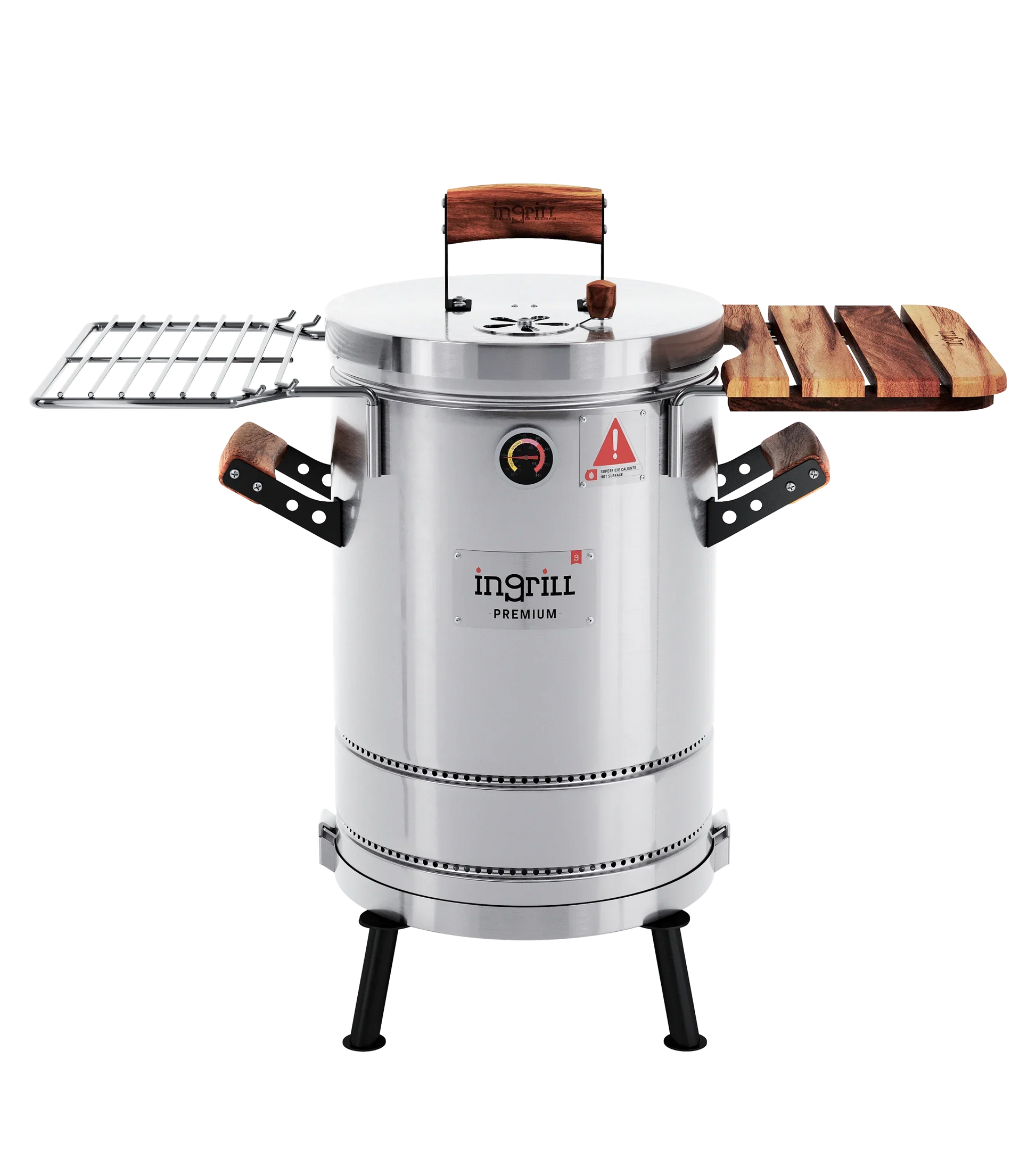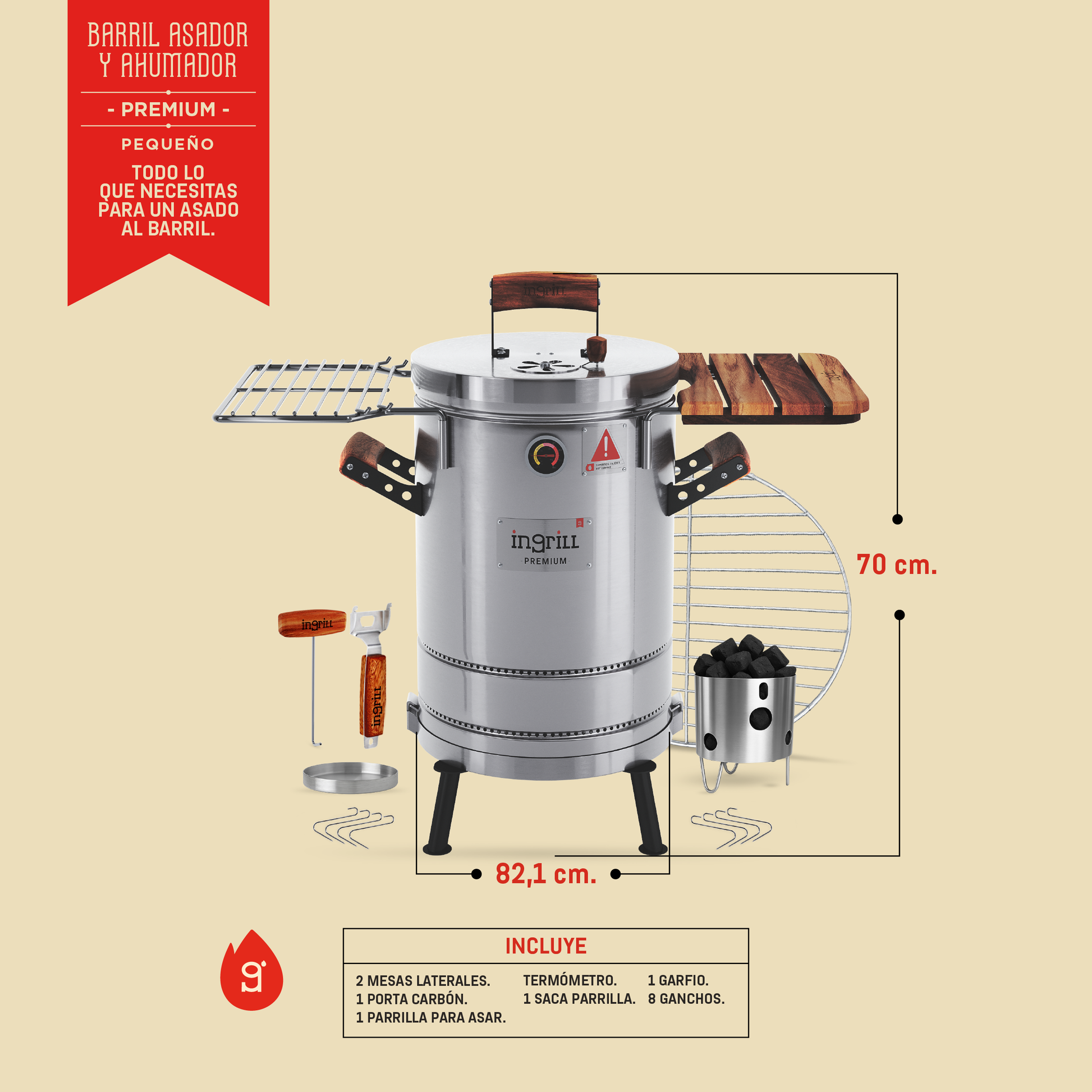 LOS BARRILES ASADORES AHUMADORES INGRILL ESTÁN DISEÑADOS Y FABRICADOS CON ACERO INOXIDABLE Y MADERAS CULTIVADAS, TORNILLERÍA DE ACERO INOXIDABLE, TERMÓMETRO, ESCLUSA DE PASO DE AIRE EN LA TAPA Y SISTEMA EXCLUSIVO DE ANCLAJE DE LA BASE AL CILINDRO.